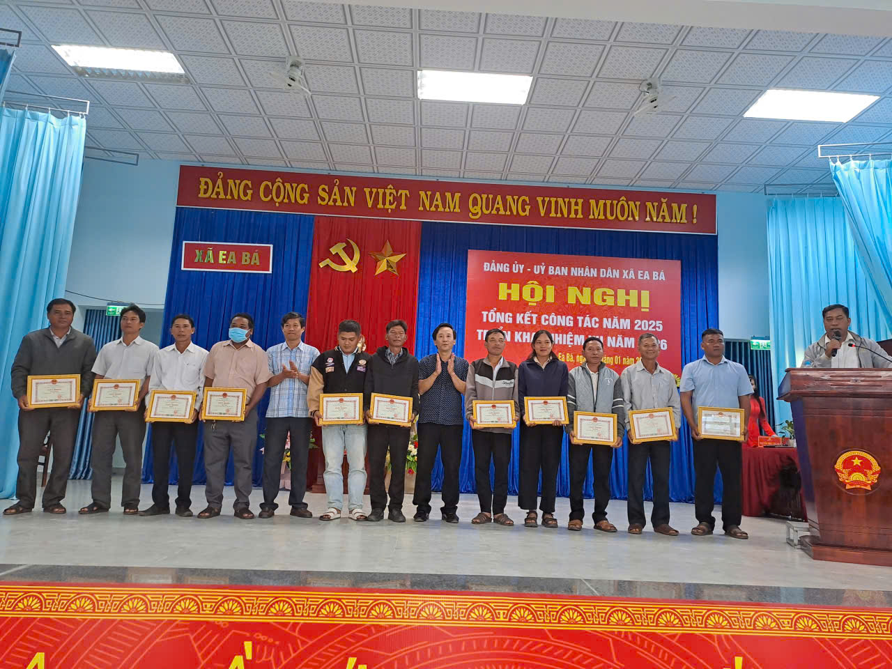 Cũng tại hội nghị, Ban Thường vụ Đảng ủy tặng giấy khen cho 03 tập thể trong đó có 02 tập thể có thành tích hoàn thành xuất sắc nhiệm vụ năm 2025, 01 tập thể có thành tích trong công tác tạo nguồn phát triển đảng viên mới; 42 đảng viên hoàn thành xuất sắc nhiệm vụ trong năm, 01 đảng viên hoàn thành xuất sắc nhiệm vụ 5 năm liền; Ủy ban nhân dân xã đã công nhận 11 thôn, buôn đạt danh hiệu “Thôn, buôn văn hóa” năm 2025, qua đó kịp thời động viên, khích lệ các tập thể, cá nhân tiếp tục phát huy tinh thần trách nhiệm, tích cực tham gia các phong trào thi đua yêu nước tại địa phương.