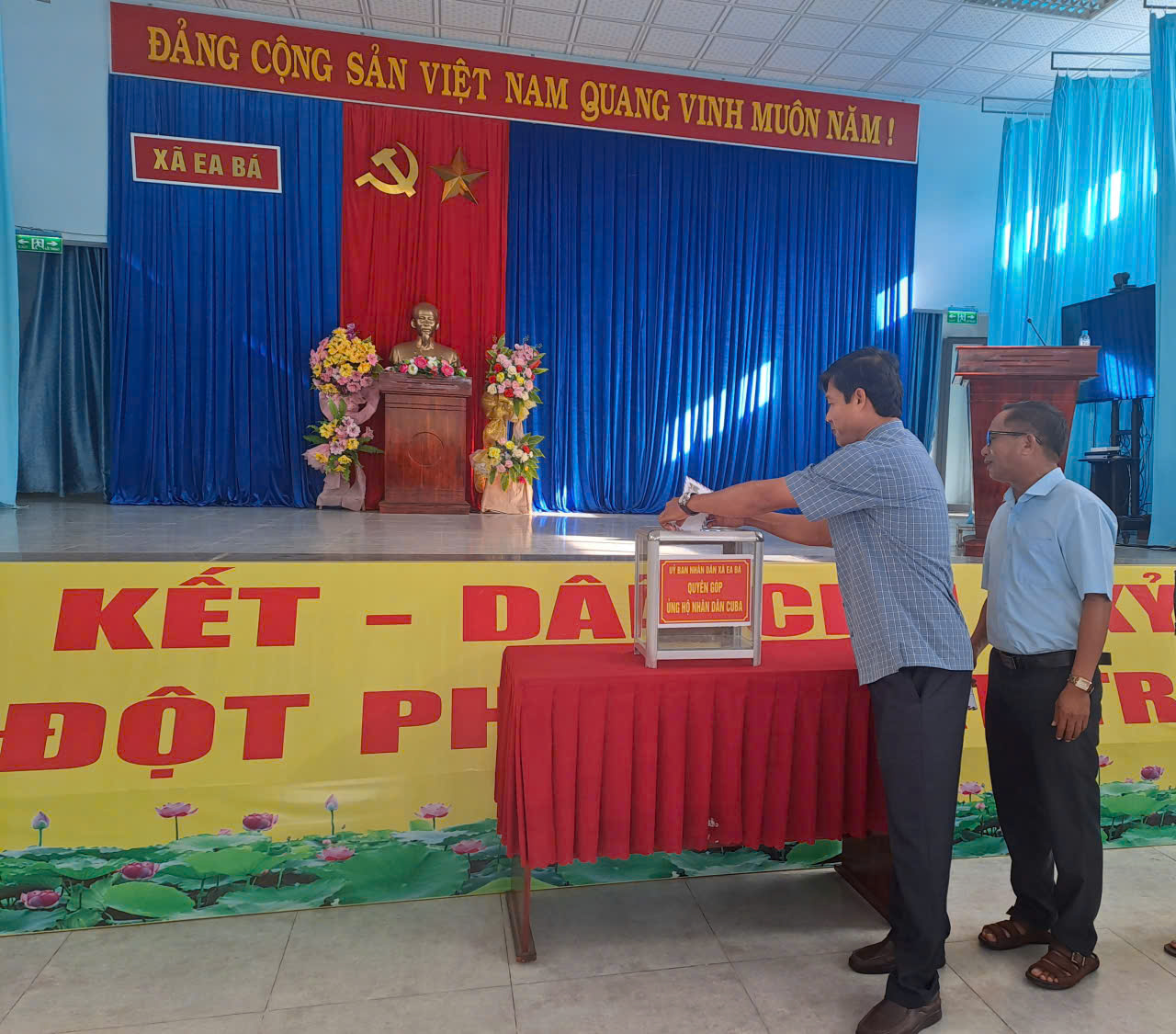 Sáng ngày 06/10/2025 UBND xã Ea Bá tổ chức chào cờ đầu tháng, đồng thời phát động chương trình vận động quyên góp ủng hộ Nhân dân Cu Ba với tổng kinh phí quyên góp được 3.230.000đ. Đây là hoạt động nhằm phát huy truyền thống nhân ái, tinh thần đoàn kết quốc tế, cùng chung tay ủng hộ Nhân dân Cu Ba vượt qua khó khăn do thiên tai, dịch bệnh và các vấn đề văn hóa, xã hội.
