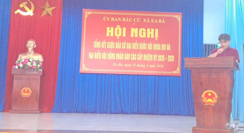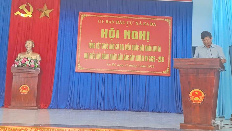Chiều 25/3/2026, Ủy ban Bầu cử xã Ea Bá long trọng tổ chức hội nghị tổng kết công tác bầu cử đại biểu Quốc hội khóa XVI và đại biểu HĐND các cấp nhiệm kỳ 2026-2031, nhằm đánh giá toàn diện kết quả tổ chức cuộc bầu cử trên địa bàn, biểu dương các tập thể, cá nhân tiêu biểu.