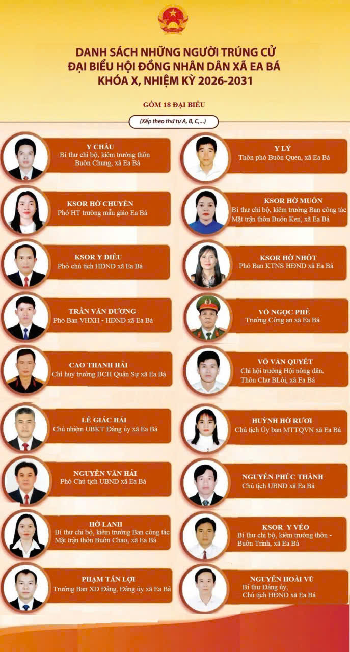 Ngày 19/3/2026, xã Ea Bá long trọng tổ chức Hội nghị công bố kết quả và danh sách những người trúng cử Đại biểu Hội đồng nhân xã Ea Bá, Khóa X, nhiệm kỳ 2026-2031. Đến dự Hội nghị có đồng chí Đặng Thị Kim Oanh, Phó Bí thư thường trực Đảng ủy xã, Phó Ban chỉ đạo bầu cử; Ủy ban bầu cử xã; đại diện lãnh đạo HĐND, UBND, UBMTTQVN xã và lãnh đạo các phòng, ban, chuyên môn, thủ trưởng các đơn vị trường học, trạm y tế và các thôn, buôn trên địa bàn xã.