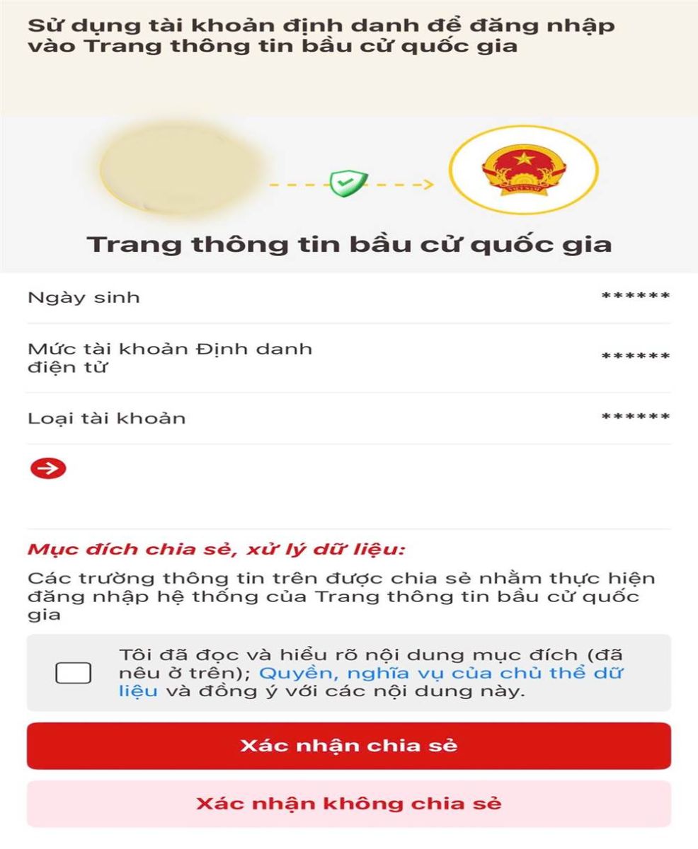 Bước 4: Tích vào ô: “Tôi đã đọc và hiểu rõ nội dung mục đích”, ấn Xác nhận chia sẻ, sau đó nhập mã Code của ứng dụng VneID.